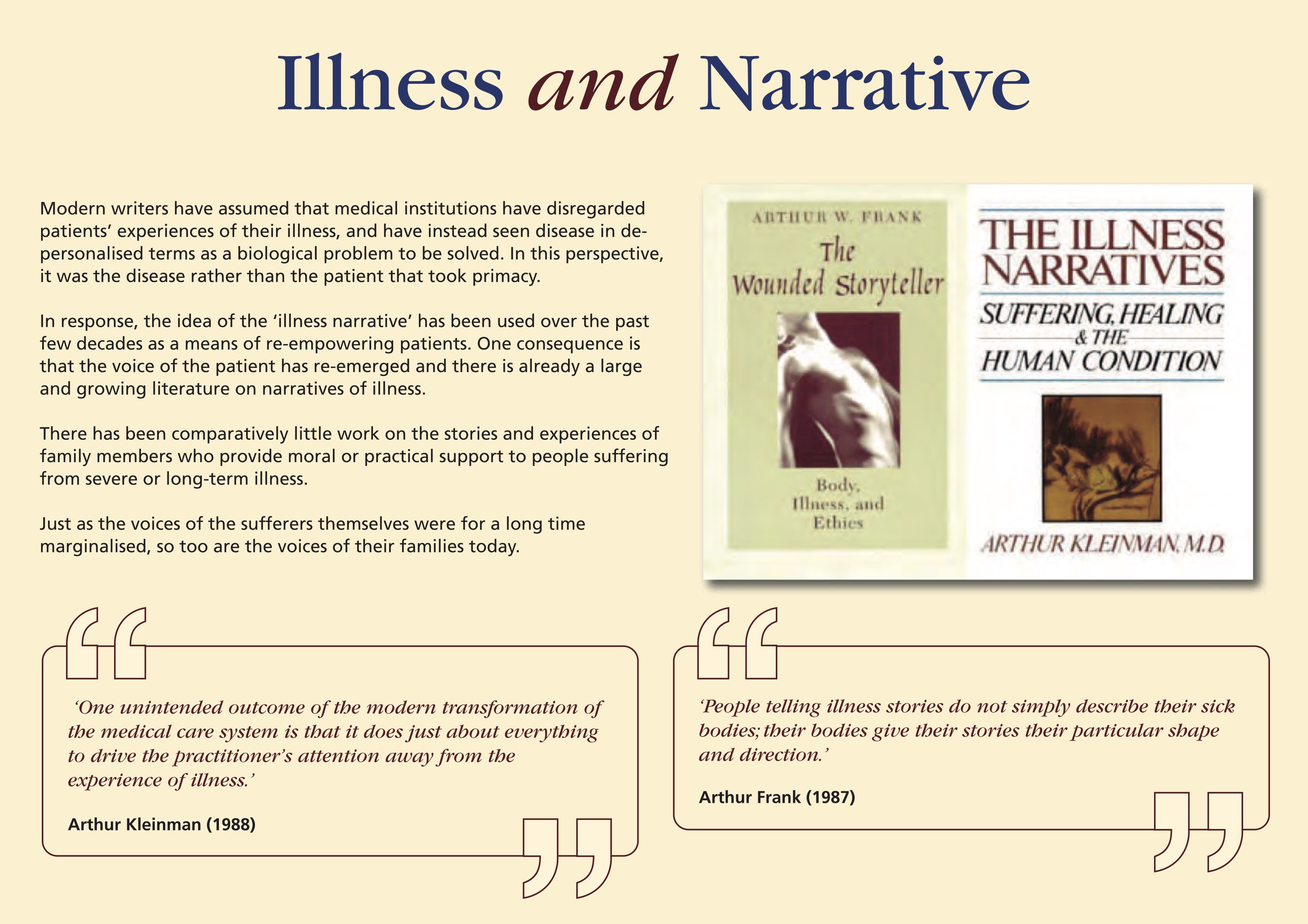 In response, the idea of the ‘illness narrative’ has been used over the past few decades as a means of re-empowering patients. One consequence is that the voice of the patient has re-emerged and there is already a large and growing literature on narratives of illness.