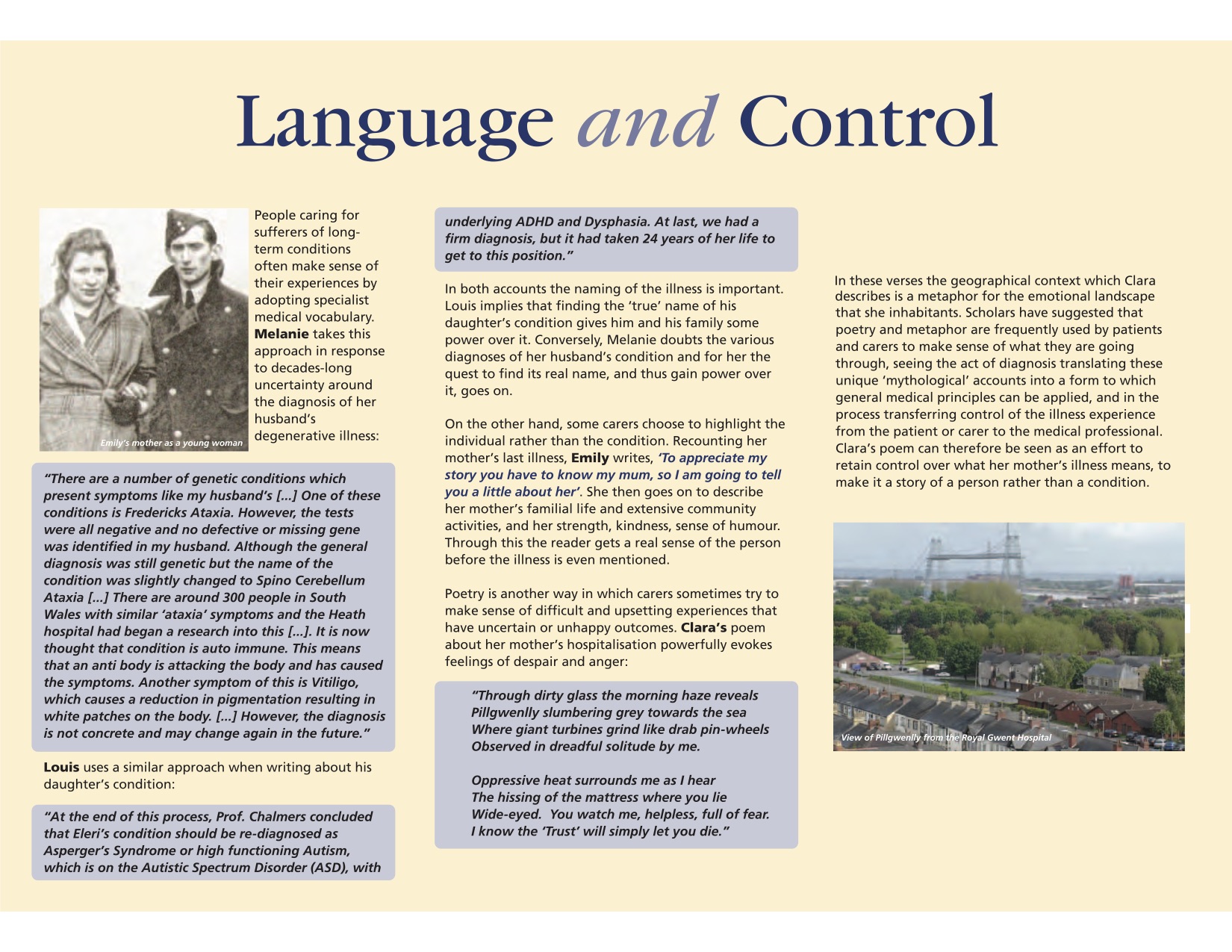 In these verses the geographical context which Clara describes is a metaphor for the emotional landscape that she inhabitants. Scholars have suggested that poetry and metaphor are frequently used by patients and carers to make sense of what they are going through, seeing the act of diagnosis translating these unique ‘mythological’ accounts into a form to which general medical principles can be applied, and in the process transferring control of the illness experience from the patient or carer to the medical professional. Clara’s poem can therefore be seen as an effort to retain control over what her mother’s illness means, to make it a story of a person rather than a condition.